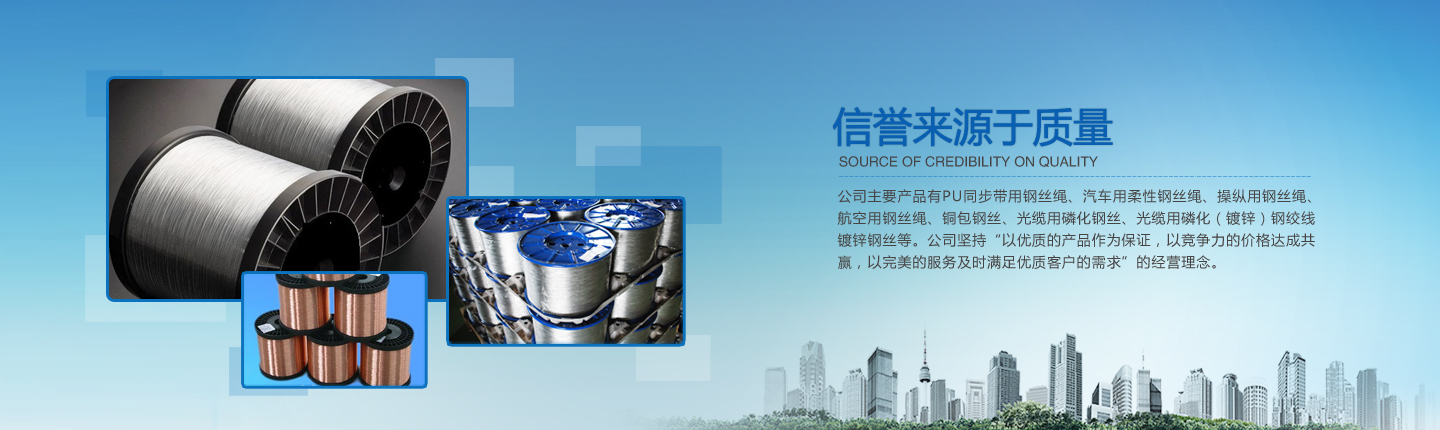 公司主要產(chǎn)品有PU同步帶用鋼絲繩、汽車用柔性鋼絲繩、操縱用鋼絲繩、航空用鋼絲繩、銅包鋼絲、光纜用磷化鋼絲、光纜用磷化(鍍鋅)鋼絞線、鍍鋅鋼絲等。經(jīng)過(guò)多年的研究、摸索、開(kāi)發(fā),公司已形成了完整的技術(shù)、工藝軟件,產(chǎn)品實(shí)物質(zhì)量均達(dá)到國(guó)際先進(jìn)水平。